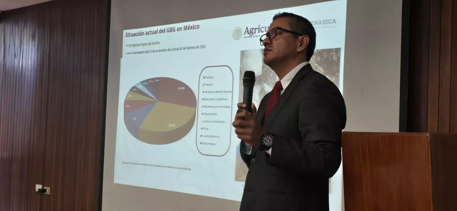 En cuanto a la distribución geográfica de los casos, indicó que el estado con mayor incidencia es Chiapas, seguido de Oaxaca. Respecto a las especies afectadas, precisó que el ganado bovino concentra el 69.82 por ciento de los casos, debido a prácticas de manejo como marcaje, colocación de aretes y otros procedimientos que pueden generar heridas.