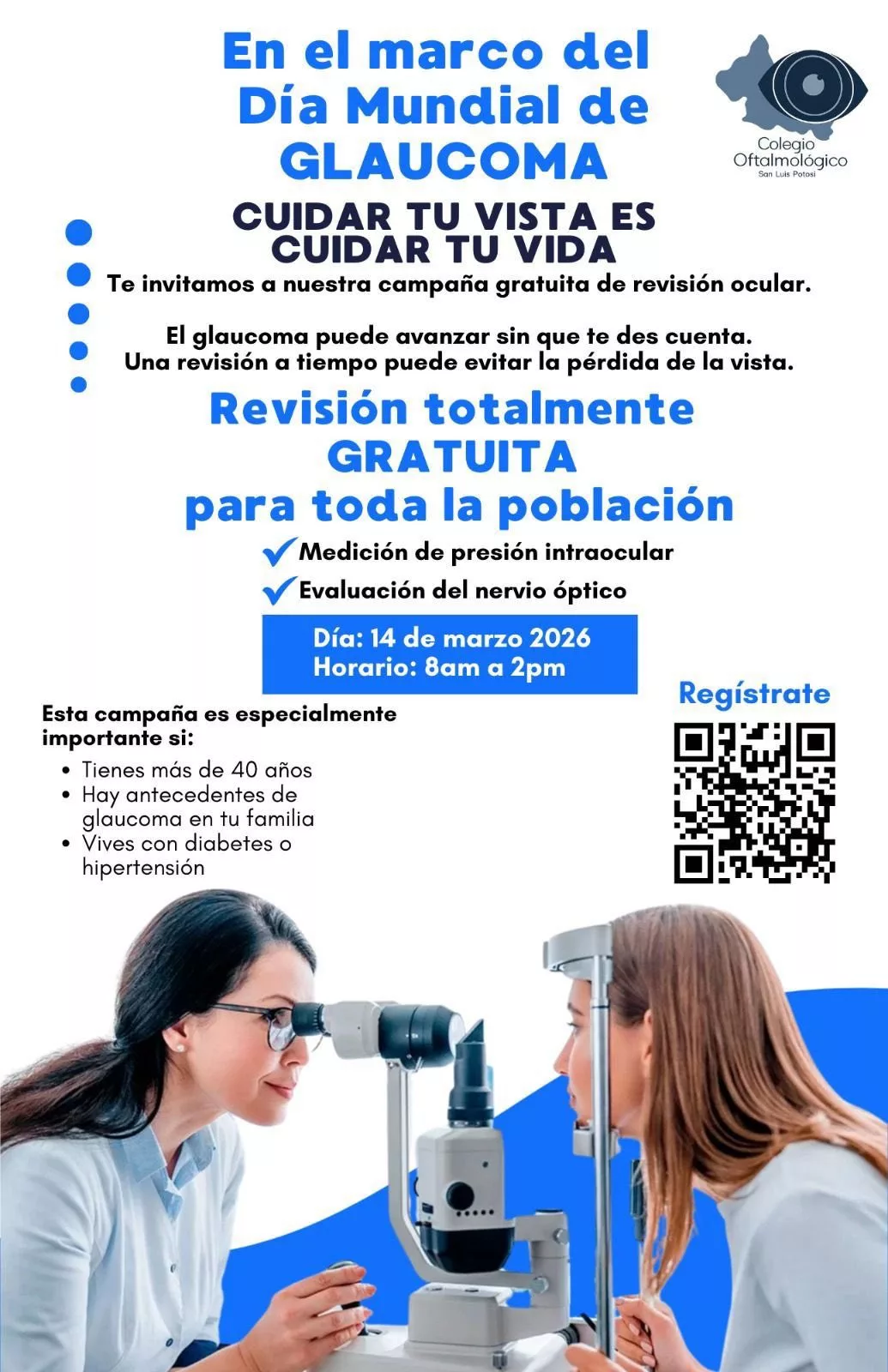 Las personas interesadas deberán registrarse en cualquiera de los centros médicos participantes mediante un código QR. La campaña se realizará el sábado 14 de marzo en un horario de 8:00 a 14:00 horas. Después de la valoración, quienes presenten sospecha de glaucoma serán citados para estudios complementarios con el fin de confirmar el diagnóstico.