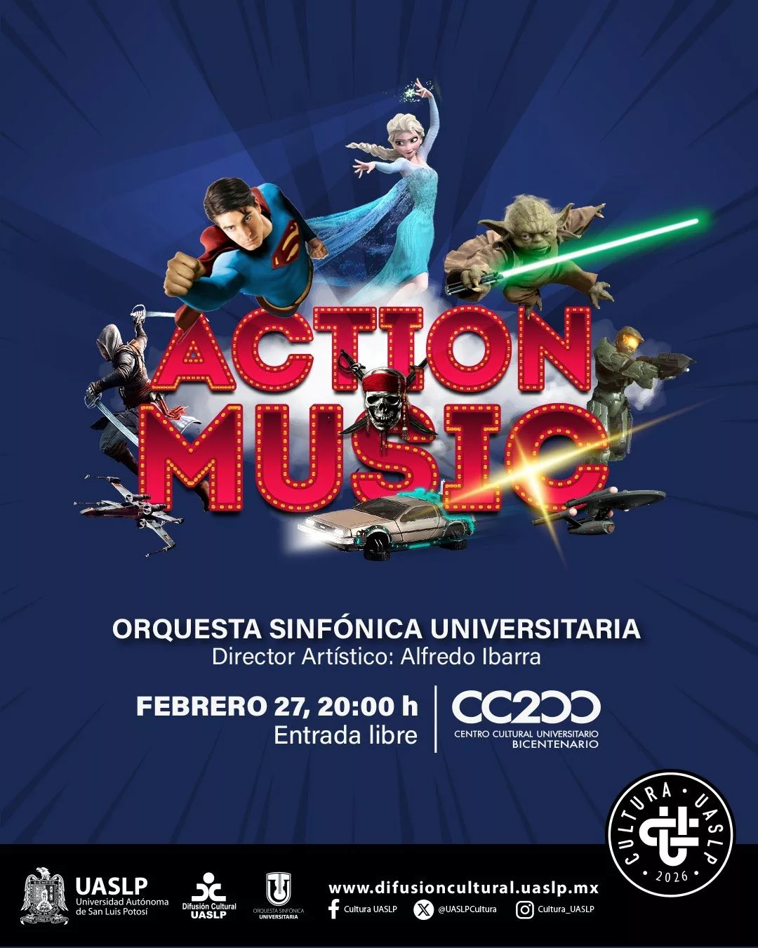 La música de grandes producciones cinematográficas resonará con el concierto “Action Music”, a cargo de la Orquesta Sinfónica Universitaria de la Universidad Autónoma de San Luis Potosí (UASLP), como parte de su Temporada 2026. La cita es el viernes 27 de febrero a las 20:00 horas, con entrada libre para todo el público.