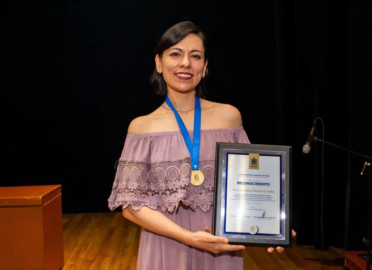 La doctora Carolina Olvera Castillo, secretaria general de la Facultad de Psicología de la Universidad Autónoma de San Luis Potosí (UASLP), y galardonada con la Presea a la Trayectoria de la Mujer Universitaria “Martha Miranda Castro” en la categoría Administrativa, dijo que, para ella, es un incentivo al trabajo de muchas mujeres que, durante años, han realizado una labor constante con compromiso ético y profesional.