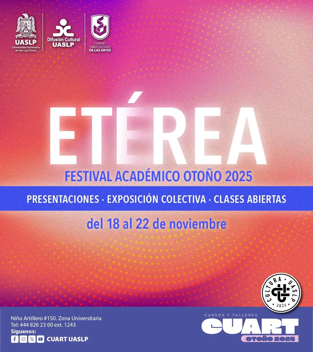 El Centro Universitario de las Artes (CUART) de la Universidad Autónoma de San Luis Potosí (UASLP) se prepara para cerrar el semestre de otoño con “Etérea”, un festival académico que ya se ha convertido en una tradición para la comunidad universitaria. La Arq. Sonia Alonso Soriano, coordinadora del CUART, compartió los detalles de esta edición, que reunirá a estudiantes de distintas carreras para mostrar el trabajo realizado a lo largo del semestre.