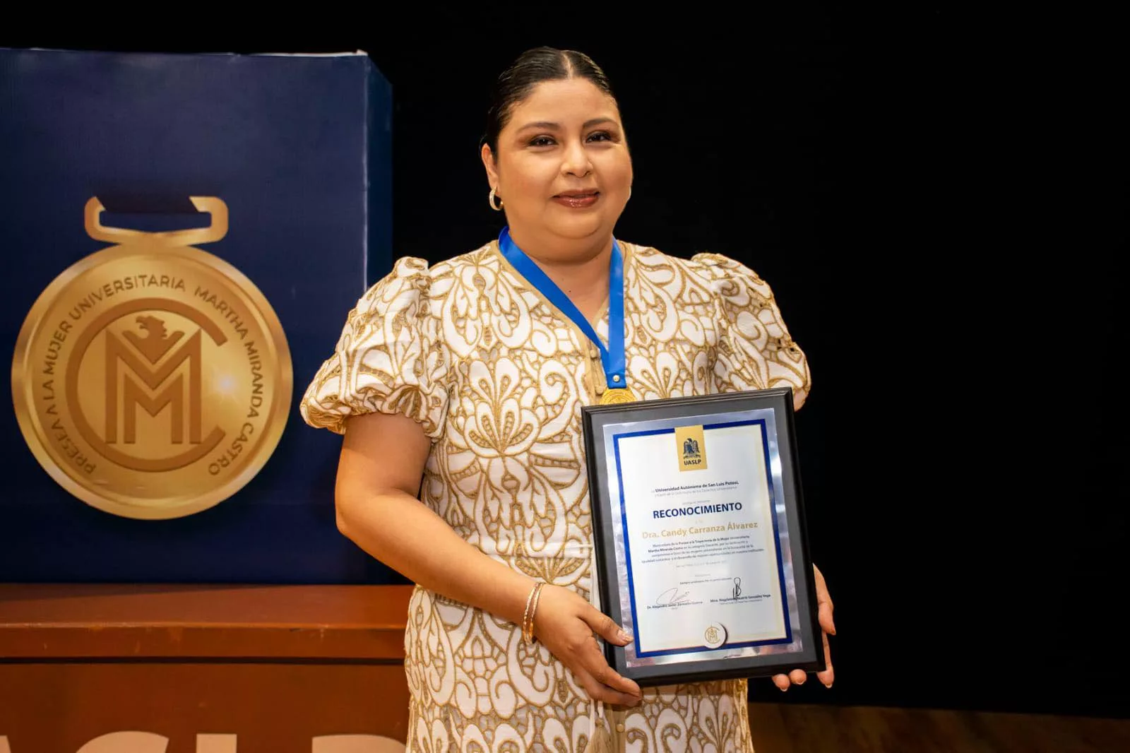 Por su destacada trayectoria académica, su contribución a la ciencia y su compromiso con el acceso al conocimiento para las mujeres, la doctora Candy Carranza Álvarez, catedrática investigadora de la Facultad de Estudios Profesionales Zona Huasteca (FEPZH), fue galardonada con la presea Trayectoria de la Mujer Universitaria “Martha Miranda Castro”, en la categoría Docente. Este reconocimiento, otorgado por la Universidad Autónoma de San Luis Potosí (UASLP), resalta su labor en la conservación del medio ambiente y en la promoción de la equidad en la ciencia.