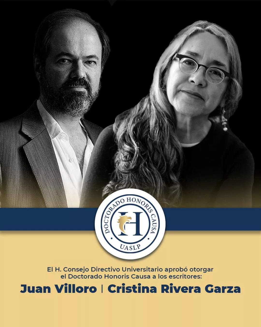 En la primera sesión ordinaria de 2026, el H. Consejo Directivo Universitario (CDU), máximo órgano de gobierno de la Universidad Autónoma de San Luis Potosí (UASLP), aprobó el otorgamiento del Doctorado Honoris Causa a la escritora Cristina Rivera Garza y al periodista y escritor Juan Antonio Villoro Ruiz, en reconocimiento a sus destacadas trayectorias y aportaciones a la literatura, la investigación y el pensamiento crítico en el ámbito nacional e internacional.