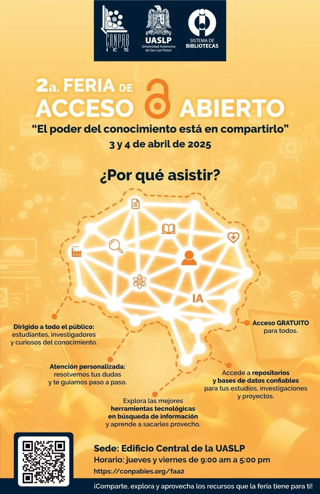 La feria se llevará a cabo en el Patio de la Autonomía del Edificio Central de la UASLP, donde se espera la participación del Instituto Potosino de Investigación en Ciencia y Tecnología (IPICYT), el Consejo Potosino de Ciencia y Tecnología (Copocyt), suministradores de bases de datos de información científica, repositorios institucionales de universidades pertenecientes al El Consejo Nacional para Asuntos Bibliotecarios de Instituciones de Educación Superior, A. C. (CONPAB-IES) y proveedores de productos potosinos.